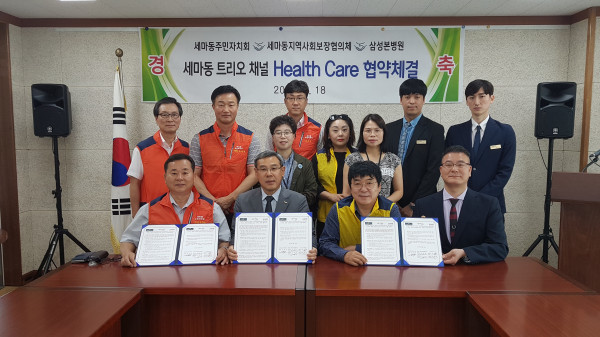 경기 오산시 세마동 주민자치위원회는 지난 18일 세마동 지역사회보장협의체 및 삼성본병원 등과 함께 세마동 저소득 취약계층 및 노인을 위한 ‘트리오 채널 건강관리 서비스 지원협약’을 체결했다. 사진은 협약식 후 관계자들이 기념촬영을 하는 모습. (사진제공=오산시청)
