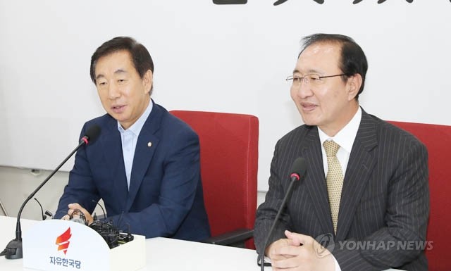 자유한국당 김성태 대표 권한대행(왼쪽)이 20일 오후 국회에서 정의당의 20대 국회 3기 원내대표로 선출된 노회찬 원내대표의 예방을 받고 인사말을 하고 있다.