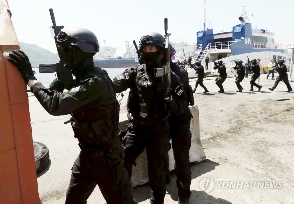 21일 오후 인천시 중구 인천항에서 열린 '2018 충무·화랑훈련'에서 중부해양경찰청 특수기동대원들이 테러범을 제압하는 훈련을 하고 있다. 이날 훈련은 테러범이 인천항에 침투해 폭발물을 설치한 상황을 가정해 이뤄졌다.