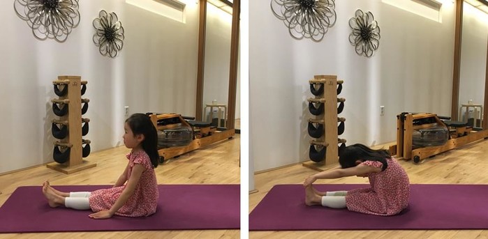 2) 숨을 들이마시고 내쉬면서 상체를 숙이고 팔을 펴서 자신의 앞쪽 가장 먼 쪽에 손을 내려놓는다. (엉덩이가 발에서 떨어지지 않을 때 까지 팔을 뻗는다)