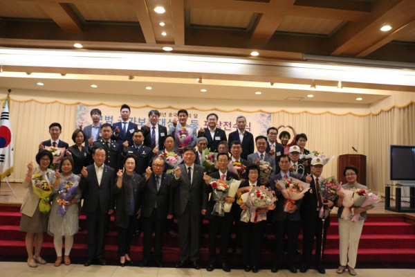 21일 서울지방보훈청은 전쟁기념관 뮤지엄웨딩홀에서 모범 국가보훈대상자 포상 전수식을 개최하고, 모범 국가보훈대상자, 사회 각 분야에서 보훈시책에 크게 기여한 대외인사들을 포상했다. 사진은 포상 전수식 후 기념촬영을 하고있는 관계자들의 모습. (사진제공=서울지방보훈청)