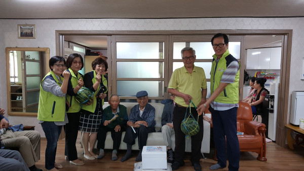경기 수원시 팔달구 지동 행정복지센터에서는 지난 22일 지역 복지를 담당하고 있는 지동 지역사회보장협의체 위원 2명과 함께 지역내 7곳 경로당을 대상으로 '무더위 쉼터' 운영사항 등을 살펴봤다. 사진은 관계자들과 노인들이 기념촬영을 하는 모습. (사진제공=팔달구청)