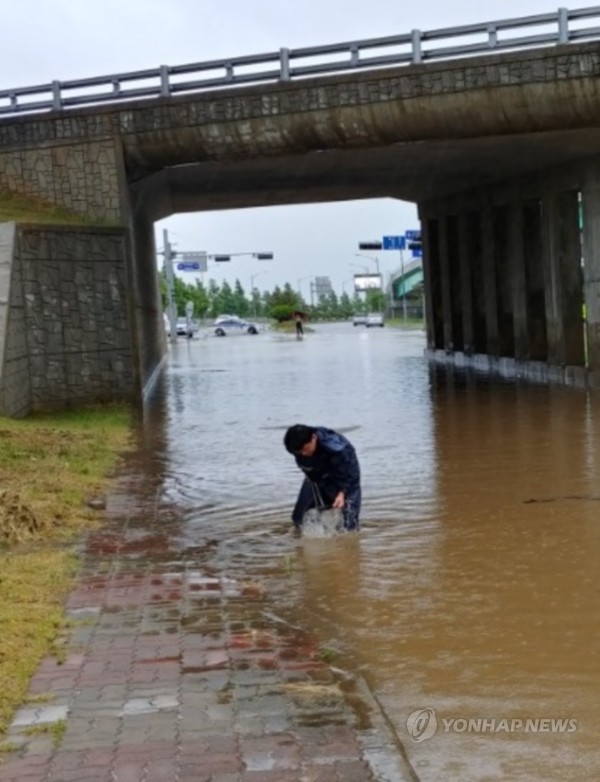 26일 오후 충남 태안군 태안읍에서 기업도시와 연결된 4차선 도로가 이날 내린 비로 인해 침수돼 양방향 차량통행이 전면 중단됐다. 호우주의보가 내려진 가운데 이날 오후 1시 현재 태안지역에는 90㎜의 강우량을 기록하고 있다.