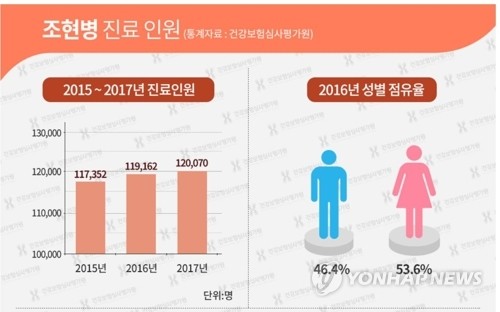 성별로는 여성이 54%(6만3765명)였으며, 남성이 46%(5만5397명)로 여성 환자가 남성보다 1만명 가량 많았다.