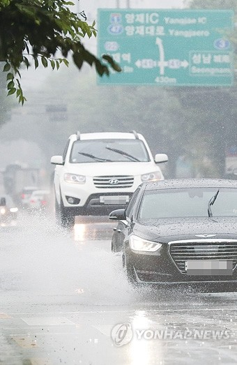 장마가 시작된 26일 경기도 수원시 팔달구 월드컵로에서 차량이 빗물이 고인 도로 위를 지나고 있다. 새벽 전남 해안 지역에서 시작된 비는 아침 전국 대부분 지역으로 확대될 전망이며 서울·경기와 강원영서북부 지역에 시간당 30㎜ 이상의 강한 비가 내릴 것으로 예상된다.