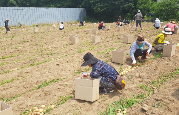 지난 25일 경기 용인시 수지구 죽전1동은 3월 통장협의회에 파종한 감자를 수확하는 행사를 개최하고, 통장협의회 회원 등 80여명이 참석한 가운데 5kg짜리 250상자 분량을 수확했다. 사진은 감자를 수확 중인 관계자들의 모습. (사진제공=용인시청)