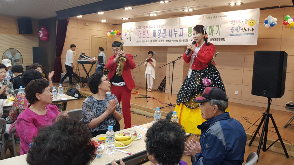 최근 노원구 상계2동 주민센터는 동주민센터 4층 강당에서 지역내 노인들을 대상으로 ‘어르신 자장면 나누고 행복 더하기’의 일환으로 자장면 대접과 함께 민요가수 공연 등을 진행했다. 사진은 민요가수가 노래를 부르고 있는 모습. (사진제공=노원구청)