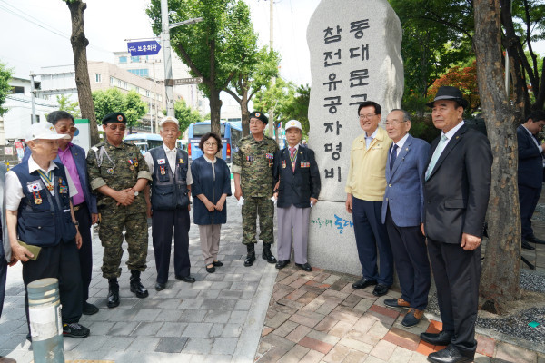 동대문구는 27일 오전, 전농동 마을마당에서 ‘참전유공자 명비 안내석 제막식’을 거행했다. 사진은 유덕열 구청장 및 관계자들이 기념촬영을 하고 있는 모습. (사진제공=동대문구청)