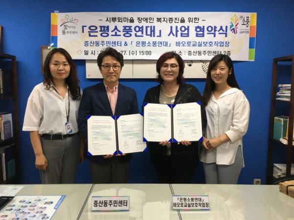 서울 은평구 증산동 주민센터와 바오로교실보호작업장은 27일 장애인과 주민이 함께 살아가는 마을을 만들고 협력체계를 구축하는 '은평구 소규모 복지시설 연대사업'에 대한 협약식을 했다. 사진은 관계자들이 협약서를 들고 기념촬영을 하는 모습. (사진제공=은평구청)