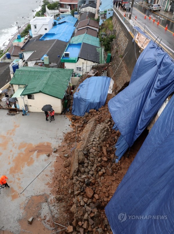 28일 부산에 시간당 최대 35㎜ 비가 내리는 등 호우경보가 발령된 가운데 영도구 흰여울마을 해안가 옹벽이 무너져 통제되고 있다.