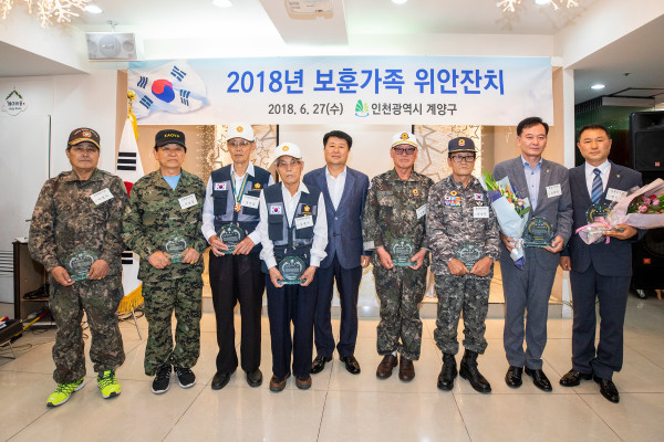 인천 계양구는 이달 '호국·보훈의 달'을 맞이해 27일 보훈단체 각 지회장과 보훈회원 약 500명이 참석한 가운데 '보훈가족 위안잔치'를 열었다. 사진은 박형우 구청장 및 관계자들이 기념촬영을 하는 모습. (사진제공=계양구청)