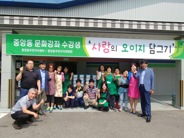 경기 오산시 중앙동 주민자치센터 문화강좌 수강생과 주민자치위원회는 27일 중앙동 행정복지센터에서 지역내 저소득 취약계층을 위한 ‘사랑의 오이지 나눔 행사’를 진행했다. 사진은 행사 종료 후 관계자들이 기념촬영을 하는 모습. (사진제공=오산시청)