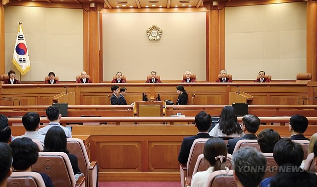 이진성 헌법재판소장을 비롯한 헌법재판관들이 28일 오후 서울 종로구 헌법재판소 대심판정에서 양심적 병역거부 허용 여부 선고를 하기 위해 자리에 앉아 있다. 헌재는 이날 ‘양심적 병역거부’와 관련한 위헌법률 심판 6건과 헌법소원 22건을 판결했다. 또, 휴대전화 발신위치를 추적하는 ‘실시간 위치추적’과 특정 기지국을 거쳐 이뤄진 통신자료를 수집하는 ‘기지국 수사’가 위헌인지도 결정했다.