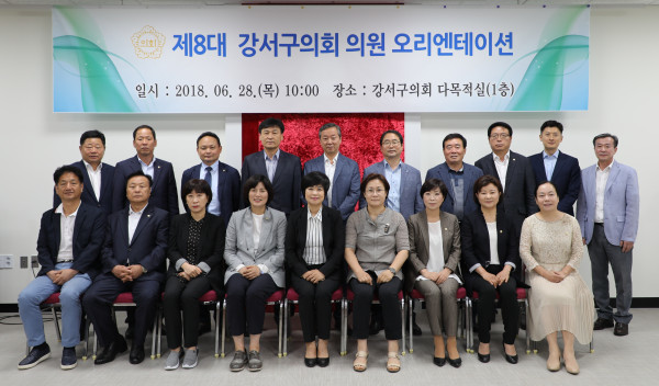 | ▲ ‘제8대 서울 강서구의원 당선인 오리엔테이션’에 참여한 의원들이 기념촬영을 하고 있다. (사진제공=강서구의회) | ||