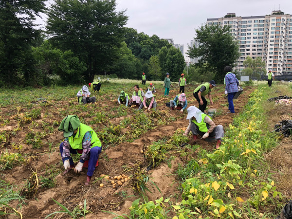 경기 수원시 영통구 시니어복지 자원봉사대는 28일 영흥공원 내 ‘사랑나눔농장’에서 감자를 수확했다. 이날 수확한 감자 150박스는 각 동주민센터를 통해 지역내 홀몸노인에게 전달됐다. 사진은 참여자들이 열심히 감자를 수확하는 모습.(사진제공=영통구청)