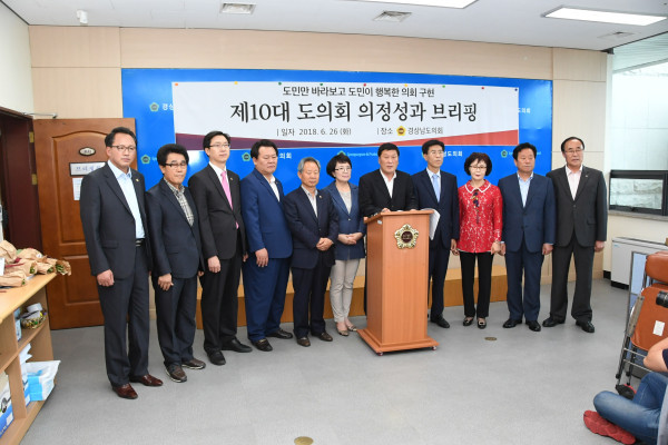 제10대 경남도의회 의원들이 모든 일정을 마무리하고 지난 4년간의 성과를 공유하고자 최근 '경남도의회 의정성과에 대해 브리핑'을 열고 그간의 의정성과를 발표하고 있다. (사진제공=경남도의회)