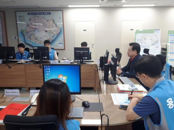 1일자로 태풍 '쁘라삐룬' 북상의 영향으로 수도권 일대에 호우주의보가 발효된 가운데 성장현 서울 용산구청장이 이날 구청 6층에 마련된 재난안전대책본부를 방문, 상황보고를 받고 있다. (사진제공=용산구청)