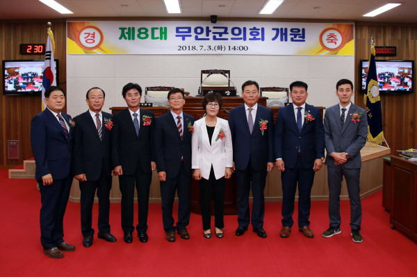 [무안=황승순 기자] 전남 무안군의회는 최근 의회 본회의장에서 김산 무안군수와 각 기관사회단체장, 그리고 제8대 의회 의원 가족 등 약 100여명이 참석한 가운데 제8대 군의회 개원식을 개최했다.