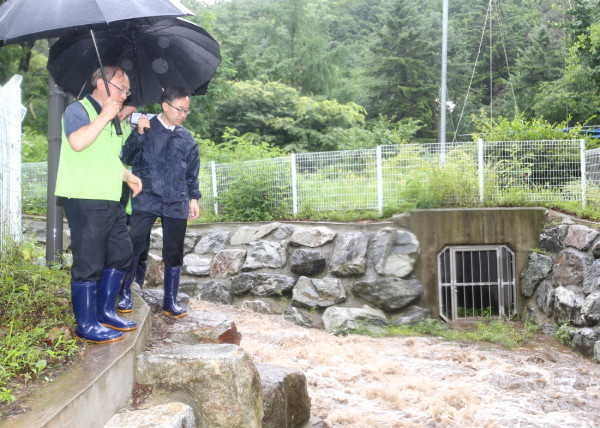 유성훈 서울 금천구청장(오른쪽)이 지난 2일 오전 예정됐던 취임식을 취소하고 침수피해방지 시설인 시흥5동 빗물저류조 현장을 찾아가 삼성산의 빗물 유입수로를 살펴보고 있다. (사진제공=금천구청)