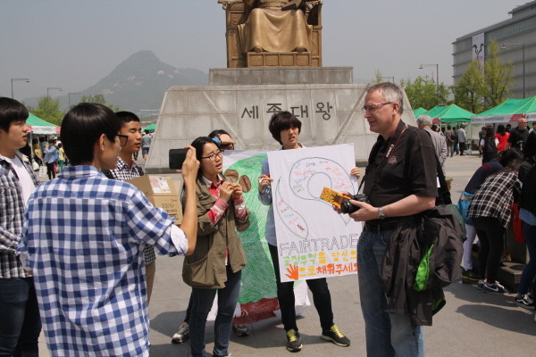 | ▲ 금천창의인재학교 체험활동에 참여한 학생들이 외국인과 공정무역에 대해 이야기를 나누고 있다.(사진제공=금천구청) | ||