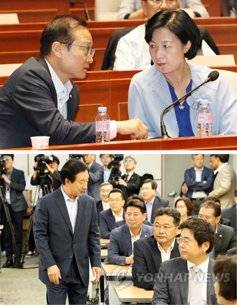 더불어민주당 추미애 대표와 홍영표 원내대표가 5일 오전 국회에서 열린 의원총회에서 대화하고 있다(위). 자유한국당 김성태 당 대표 권한대행 겸 원내대표가 5일 국회 의원회관에서 열린 원외당협위원장 간담회에 참석하고 있다.