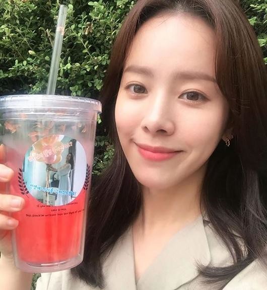 공개된 사진 속에는 팬들에게 선물받은 음료를 들고 미소를 짓고 있는 한지민의 모습이 담겼다.