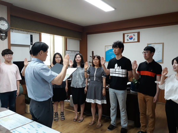 충남 아산시 온양5동은 정부의 ‘공공부문 1회용품 줄이기 실천지침’에 따라 이달부터 청사내 1회용품 사용을 금지하고 있다. 사진은 5일 온양5동 직원들이 심흥섭 온양5동장의 선서문 낭독에 따라 1회용품 사용 줄이기 선서를 하고 있는 모습. (사진제공=아산시청)