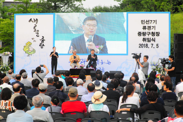 류경기 중랑구청장(오른쪽)이 5일 오후 중랑캠핑숲 잔디광장에서 개최된 민선7기 중랑구청장 취임식에서 김민웅 경희대 교수와 함께 민선7기 중랑의 비전에 대해 이야기를 나누고 있다. (사진제공=중랑구청)