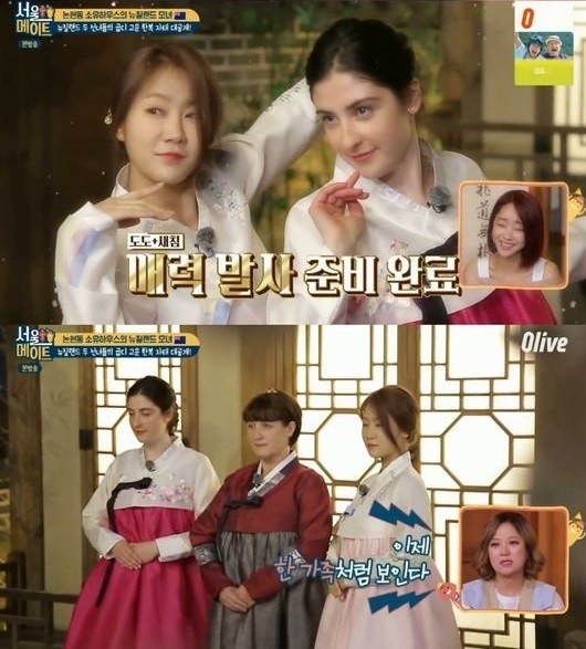 캐서린은 소유가 정성스럽게 드라이한 '볼륨 빵빵' 머리에 귀여운 배씨댕기로 단아한 매력을 뽐냈고, 틸리는 단정한 댕기머리에 사랑스러운 핑크 한복으로 미모를 뽐냈다. 여기에 소유 역시 우아하게 한복을 차려 입어 캐서린, 틸리와 세 모녀같은 다정한 모습을 연출했다.