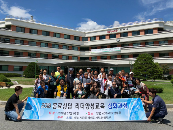 경기 안성시 중증장애인자립생활센터는 지난 2~3일 양일간 코바스연수원에서 ‘동료상담가 리더 양성교육 기초·심화과정’을 진행했다. 사진은 교육에 참석한 관계자들이 교육 종료 후 기념촬영을 하는 모습.(사진제공=안성시청)