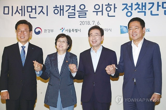 6일 오전 서울 중구 달개비에서 열린 '미세먼지 해결을 위한 정책간담회'에서 수도권 광역자치단체장과 환경부 장관이 미세먼지 해결을 위해 손을 맞잡고 있다. 왼쪽부터 이재명 경기도 지사, 김은경 환경부 장관, 박원순 서울 시장, 박남춘 인천 시장.