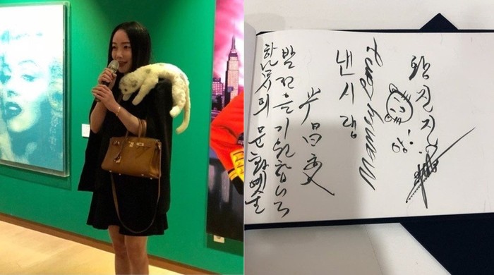 공개된 사진 속 낸시랭은 팝아트 작품 앞에서 마이크를 들고 열심히 설명하는 모습. 낸시랭의 어깨에는 고양이 코코샤넬도 함께 해 눈길을 끌었다.