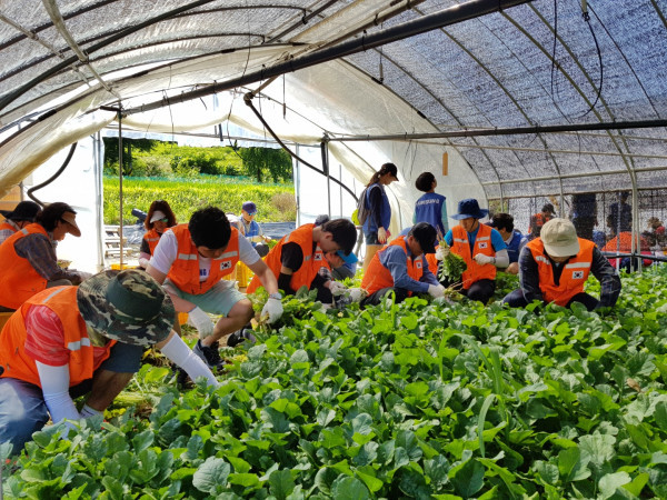 재단법인 경기 용인시자원봉사센터는 지난 7일 용인시 공무원 50여명과 함께 처인구 원삼면 두창리 큰그림농장에서 열무수확 봉사를 실시했다. 사진은 참여자들이 열심히 열무를 수확하는 모습. (사진제공=용인시청)