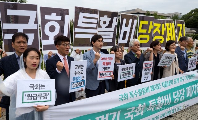 9일 오전 서울 국회 정문 앞에서 참여연대 회원들이 국회 특수활동비 폐지와 지출내역 공개 촉구 기자회견을 하고 있다.