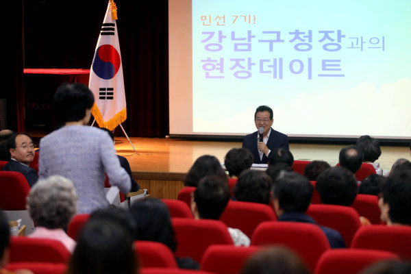 강남구는 9일 오후 논현1동 문화센터에서 ‘구청장과의 현장데이트’를 열어 구민에게 민선 7기 공약 및 주요 구정 운영방향을 설명하고 구민과 대화하는 시간을 가졌다. 사진은 현장데이트에서 정순균 구청장이 구정발전 기여자로 선정된 구민에게 감사장을 수여하는 모습. (사진제공=강남구청)