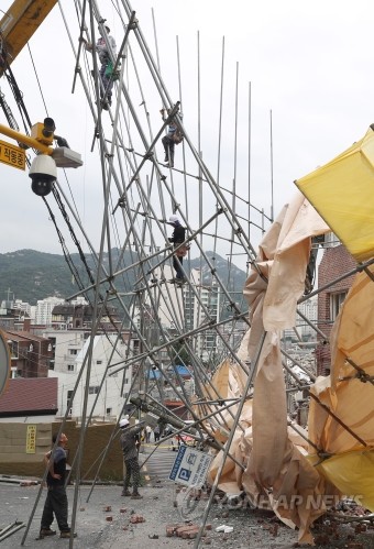 10일 서울 서대문구 홍은동 한 아파트 건설현장의 철거용 철제구조물과 가림막이 넘어져 전깃줄과 전신주 및 도로를 덮쳤다. 이 사고로 다행히 인명피해는 없는 것으로 전해졌다. 공사 관계자들이 무너진 철제구조물 위에서 작업을 이어가고 있다.