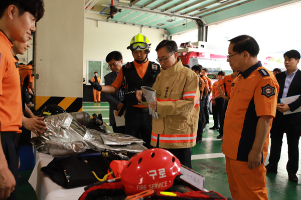 서울 구로소방서가 10일 소방관서를 방문한 유성훈 금천구청장을 대상으로 화재, 구조 등 소방활동 체험을 해보는 일일 소방안전체험을 실시했다. 사진은 유 구청장이 소방장비를 살펴보고 있는 모습.(사진제공=구로소방서)