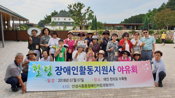 경기 안성시 중증장애인자립생활센터 소속 장애인활동지원사 20명은 지난 7일 충남 태안군 천리포 수목원에서 진행된 ‘힐링 장애인활동지원사 야유회’에 참석했다. 사진은 야유회에 참여한 활동지원사들이 기념촬영을 하는 모습. (사진제공=안성시청)