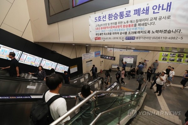서울교통공사가 5호선 동대문역사문화공원역 환승통로에 설치된 노후 에스컬레이터 교체 공사를 위해 오는 18일부터 10월31일까지 5호선 환승통로를 전면 폐쇄한다고 밝혔다. 공사 기간 환승통로가 폐쇄되면 5호선과 2,4호선 간 환승이 불가능하다. 사진은 11일 서울 5호선 동대문역사공원역사공원역 환승통로 에스컬레이터.