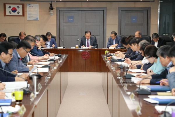 유동균 마포구청장(가운데)이 지난 9일 오전 마포구청 대회의실에서 민선7기 첫 확대간부회의를 주재해 구청 관계자들로부터 전부서의 7월 업무계획과 구정 전반 사항을 보고받고 있다. (사진제공=마포구청)
