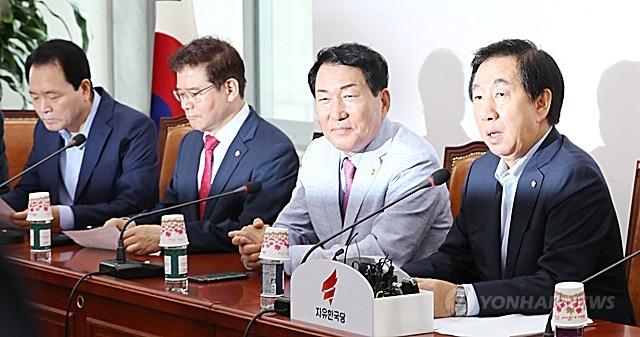 자유한국당 김성태 당대표 권한대행(오른쪽)이 11일 오전 국회에서 열린 원내대책회의에서 발언하고 있다.