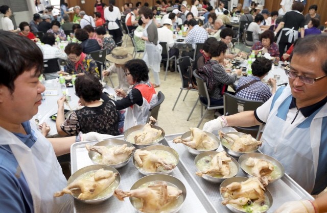 초복(오는 17일)을 앞두고 11일 부산 해운대구 재송동에 있는 해운대종합사회복지관에서 포스코건설 부산지역 현장 직원들이 노인 450명에게 삼계탕을 대접하고 있다. 어르신들이 무더위를 이기고 건강하게 여름을 날 수 있도록 보양식을 대접하자는 취지로 기획된 이 행사는 2008년부터 이어지고 있다.