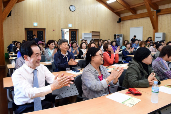 | ▲ 지난해 열린 '2017 여성지도자 역량강화 워크숍'에 참여한 안병용 시장(왼쪽)이 박수를 치고 있다. (사진제공=의정부시청) | ||