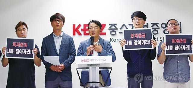 12일 오후 서울 영등포구 중소기업중앙회에서 열린 최저임금 인상에 따른 지원대책 마련 촉구 기자회견에서 성인제 전국편의점가맹점협회 공동대표가 발언하고 있다.