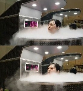 설리는 기계 안에서 얼굴을 찡그리며 괴로워하고 있는 모습이다. 숨을 가쁘게 내뱉으면서 인상을 짠뜩 찌푸린 설리는 온도를 체크하면서 고통스러워하고 있다. 영상 속 기계는 설리의 말처럼 영하 140도 가까이 내려간 모습이다.