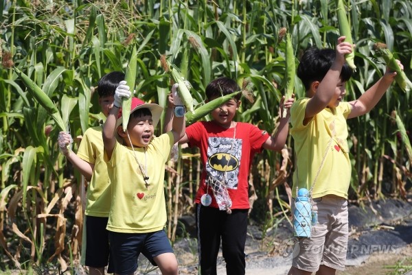 16일 오전 경기도 성남시 중원구 여수동 성남시민농원에서 열린 옥수수 수확 체험행사에서 어린이들이 직접 수확한 옥수수를 들고 밭에서 나오고 있다.