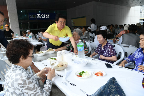 경기 구리시 교문1동 새마을지도자와 새마을부녀회는 지난 12일 공동주관으로 지역내 홀몸노인 200여명을 대상으로 ‘사랑의 삼계탕 대접 행사’를 진행했다. 사진은 행사에 참석해 노인들에게 삼계탕을 전달하고 있는 안승남 시장의 모습. (사진제공=구리시청)