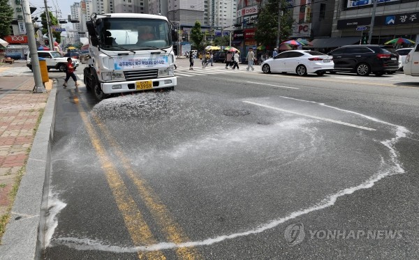 36도를 오르내리는 폭염이 연일 지속된 16일 오후 광주 동구 운암동의 한 거리에서 광주 북구청 안전총괄과 직원이 운전하는 살수차가 뜨겁게 달아오른 아스팔트에 물을 뿌리고 있다.