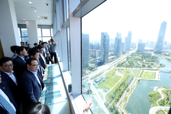 | ▲ G타워를 방문한 인천시의원들이 33층 홍보관을 둘러보고 있다. 이날 의원들은 인천시 주요건설현장을 방문해 현장 상황을 확인하고 관계자들로부터 사업현황을 청취했다. (사진제공=인천시의회) | ||