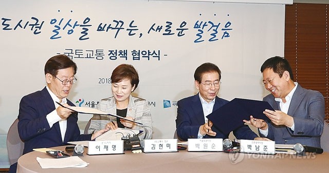 이재명 경기도지사(왼쪽부터), 김현미 국토교통부 장관, 박원순 서울시장, 박남춘 인천시장이 17일 오후 서울 중구 프레스센터에서 열린 '국토교통 정책 협약식'에서 협약서 서명 후 전달하고 있다. 국토부 장관과 이들 수도권 광역단체장은 광역교통청 설립과 신규 공공주택지구 확보 등 수도권 주요 현안 해결에 협력하기로 뜻을 모았다.